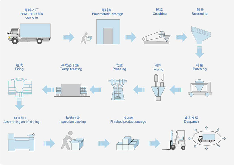 根據(jù)耐火材料生產(chǎn)工藝特點和 ISO體系,制定了嚴格的質(zhì)量管理標準。它規(guī)定,質(zhì)檢員對每一道工序的成品及半成品都必須進行定點、定量抽查,并與隨機抽查交叉進行。不合格半成品及不合格率超標的批次產(chǎn)品及時報廢,每道工序的工作量都由下道工序的質(zhì)檢員確定。
